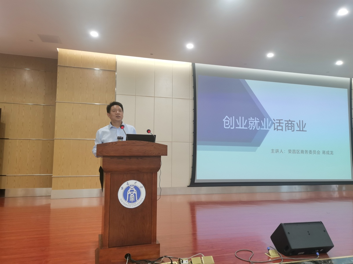 蒋成龙书记就荣昌区商业现状分析、荣昌区商业未来发展规划、大学生创业就业思路等内容展开,他指出,荣昌区当下按照“一区两圈、一圈多街、一圈一特色、一街一风格”工作思路,抢抓成渝地区双城经济圈建设重大战略机遇,有着前所未有的发展契机;并通过分享创业成功个人、先进企业等案例,鼓励当代大学生勇于创新、积极创业,希望yl6809永利集团学子以发展眼光看荣昌区商业机遇,并欢迎学子们扎根荣昌,创业发展;最后,他讲到“创业即就业”,就业创业更是探索人生价值的重要方式,地方政府与高校之间应加强合作,共促发展,探索有效的人才激励机制,实现人才就业创业的多元化、本土化。