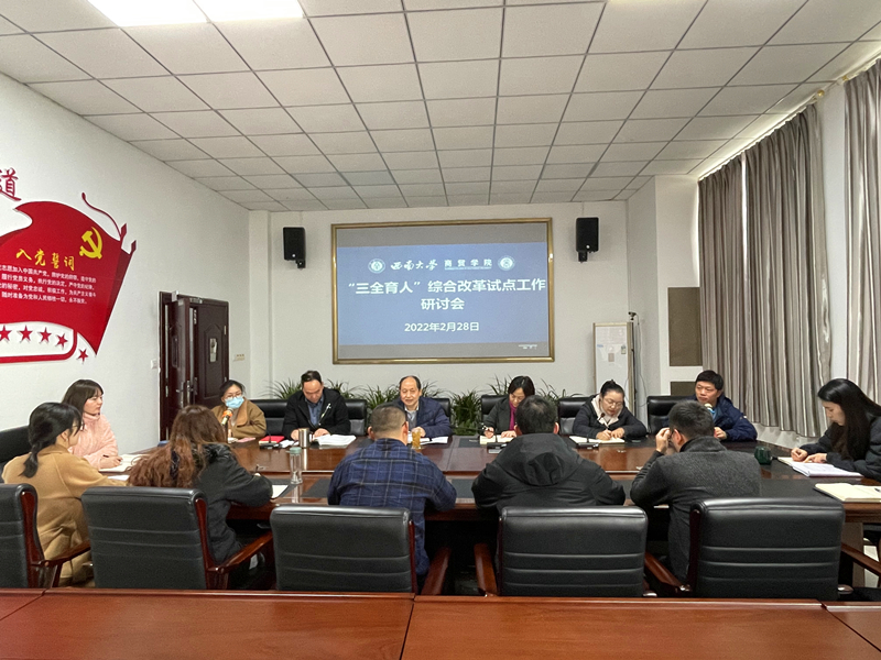 2月28日下午,yl6809永利集团在8401会议室召开“三全育人”综合改革试点工作研讨会。学院党委书记周国安,党委副书记、纪委书记兰英,副院长胡继宽,党委委员、组织员刘莉莉,纪委委员、教学办主任刘光英,团委书记、学工办主任廖鹏,国际贸易与营销系副主任谢向伟,教师代表张军博士、王京雷博士以及全体辅导员参会。
