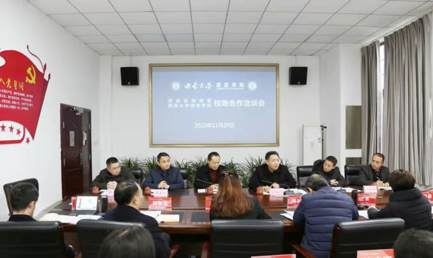 11月29日下午,荣昌区商务委党委书记、主任蒋成龙一行来院调研推进校地合作共建有关工作。学院党委书记周国安、院长李晓阳等相关领导参加洽谈会,学院副院长韩毅主持会议。