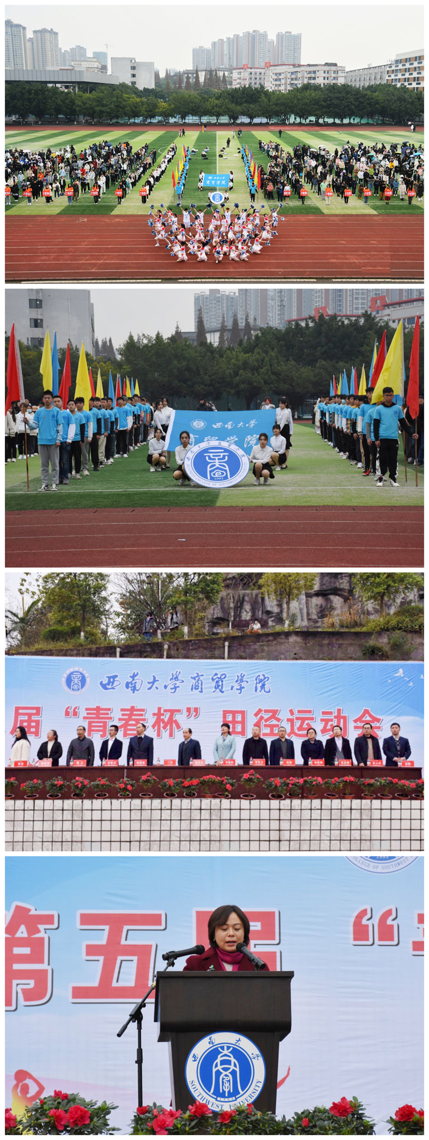升完国旗后,表演方队的精彩表演赢得现场热烈掌声。紧接着,学院院长李晓阳致辞。李院长称赞了商贸运动健儿在各项赛事中取得的佳绩,希望本次运动会中的参赛者奋勇争先、裁判员公正公平、观众团结友爱,预祝运动会圆满成功。