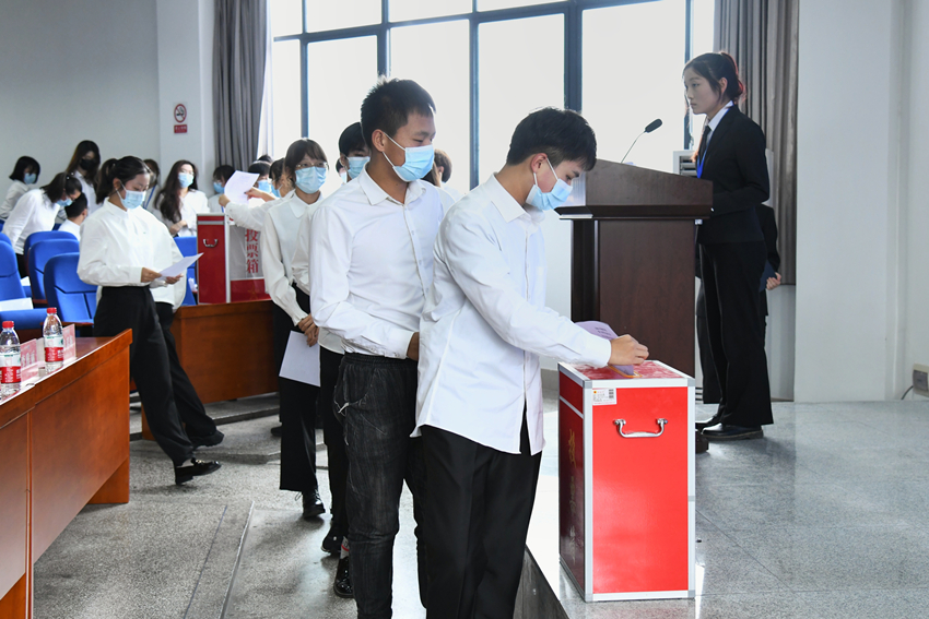 开幕式结束后,大会审议并通过了《yl6809永利集团学生会章程》《yl6809永利集团学生会主席团成员选举办法》以及监票员、计票员名单。大会在总监票人的主持下,通过无记名投票选举的方式,公开、公平、公正地选举产生了第五届学生会主席团成员,成员包含李婷婷、杨青宇、李博雅等三名学生。