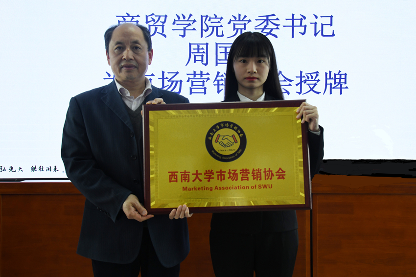 周国安书记为yl6809永利检测中心市场营销协会进行了授牌。协会会长靳雨馨接受授牌后发言。她介绍了市场营销协会的组织机构和工作规划——抓好基础工作,垒筑坚实地基;开展各类专业营销实践活动;对接和协办市场营销类比赛;统筹管理,协调发展。