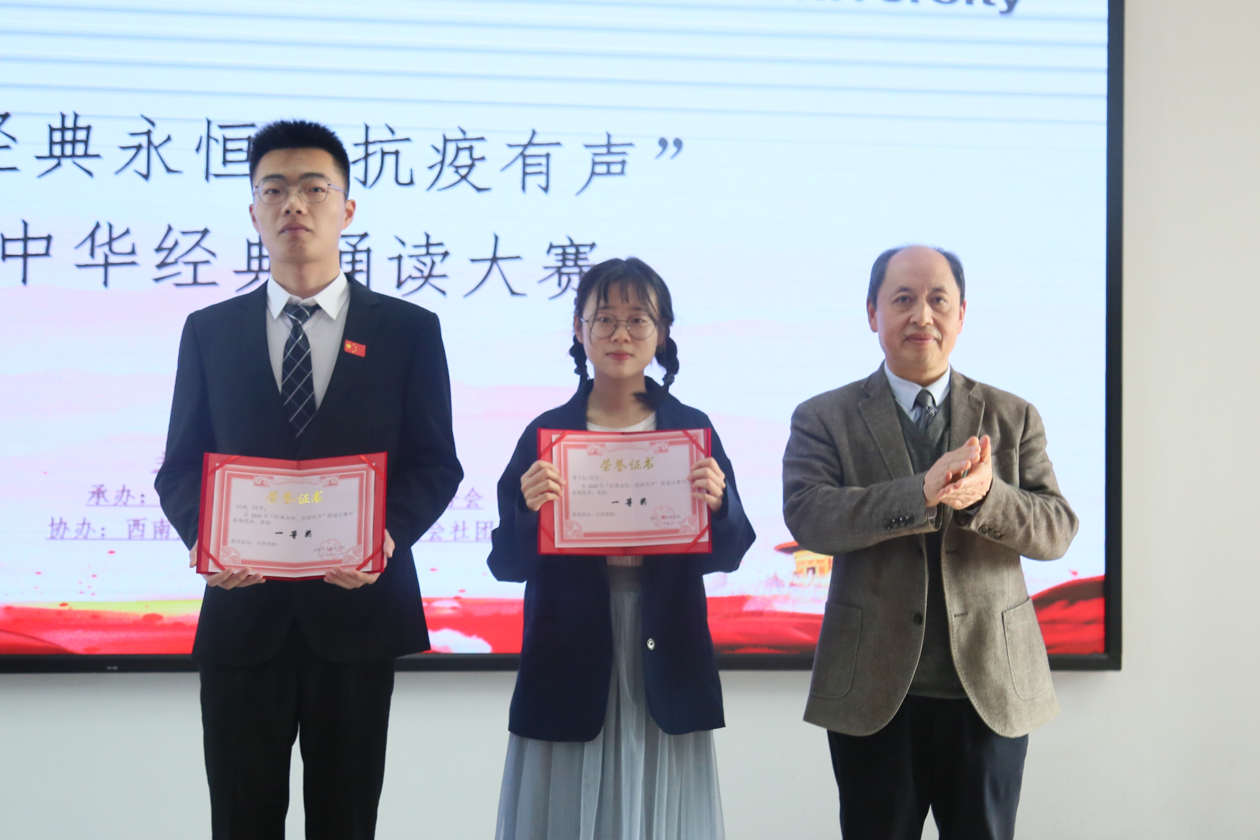 比赛伊始,学院党委书记周国安为大赛致辞。在致辞中,周书记对举办本次比赛表示热烈祝贺,对精心筹备和参加本次比赛的师生表示衷心感谢。他强调,举办本次比赛,旨在培育师生学经典、诵经典的学习氛围,提升师生文化素养,提升师生的制度自信、文化自信;旨在弘扬抗疫过程中全国人民听党指挥、团结一心、众志成城的集体主义精神,弘扬抗疫英雄们不畏病毒、舍生忘死、前赴后继的高尚品德与职业素养。周书记指出,当代大学生需要学习中华民族优秀传统文化、经典文化,需要弘扬中国人民伟大抗疫精神,真正成为有品德有担当有作为的栋梁之才。