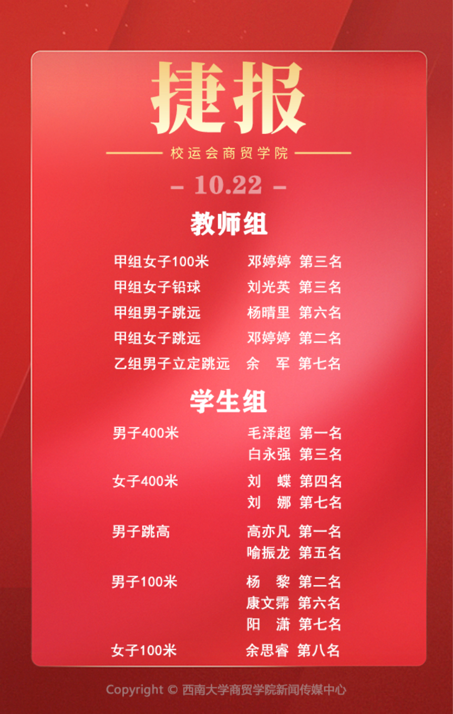 本届校运会10月22日yl6809永利集团学生获奖具体情况如下: