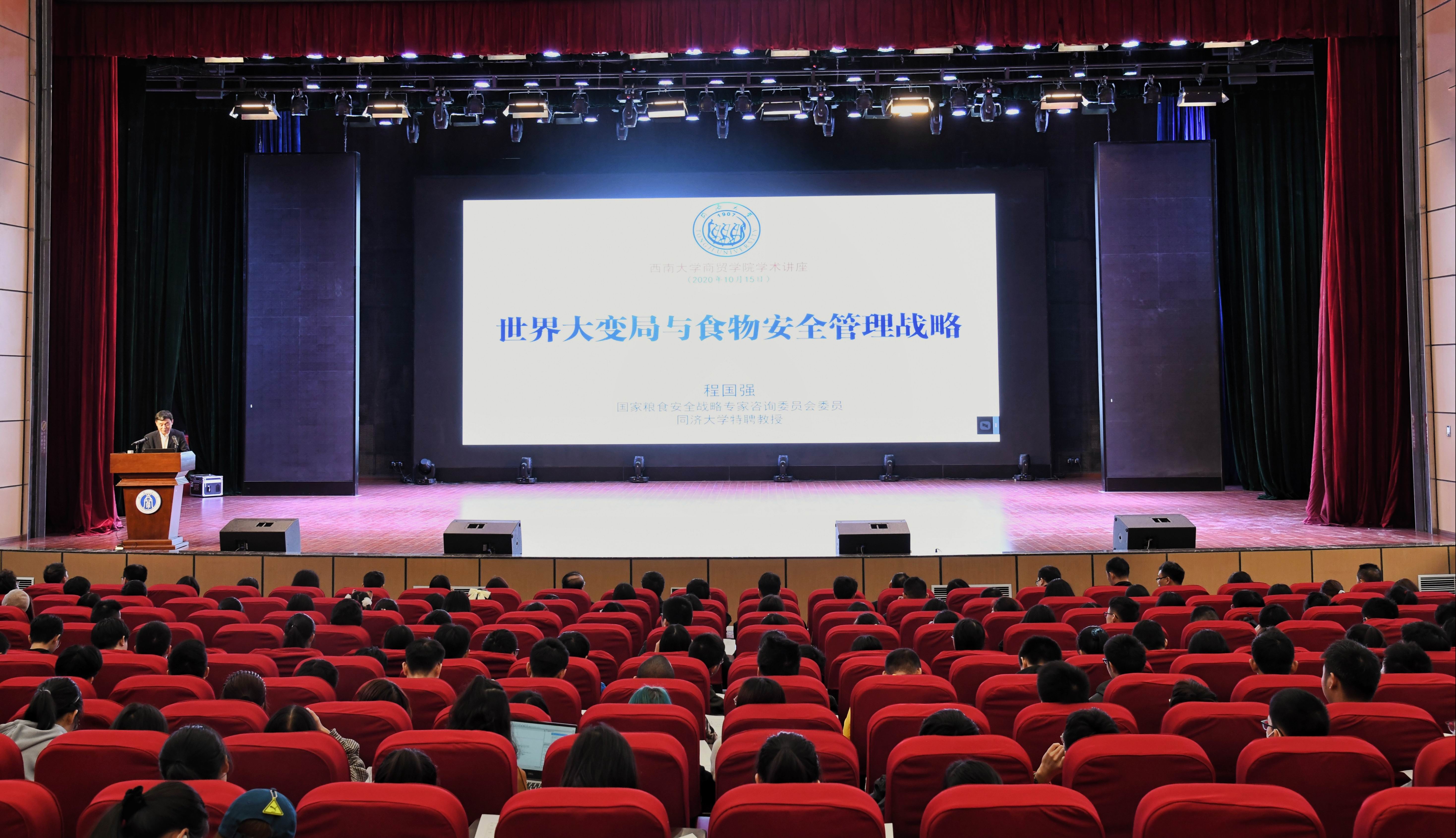 应yl6809永利集团副院长(主持工作)李晓阳教授邀请,同济大学程国强教授于10月15日来访yl6809永利集团并在学生活动中心为全院师生作了题为《世界大变局与食物安全管理战略》的学术讲座,学院党政领导、部分教师及600余名学生参加讲座,学院党委书记周国安主持讲座。
