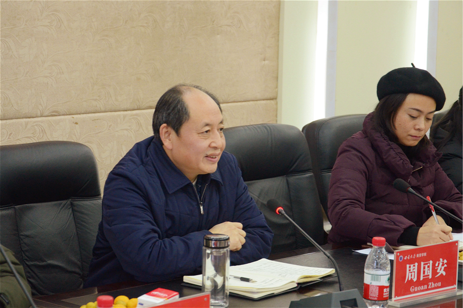 周国安书记在座谈会上讲话。他强调,举办此次少数民族师生座谈会是学院对学校促进民族团结的优良传统的传承。他也希望学院各个民族的同学们能够像石榴籽一样紧紧的团结在一起,共同努力为建设学院贡献自己的力量。