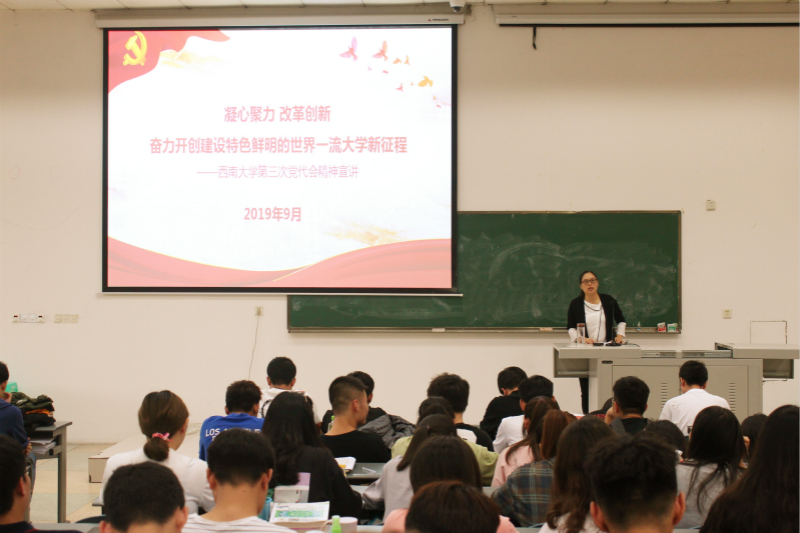 为进一步学习贯彻学校第三次党代会精神,及时把全校师生的思想和行动统一到党代会精神上来,在学院迅速掀起学习和宣传大会精神的热潮,学院党委组建宣讲团,对学生开展学校第三次党代会精神集中宣讲工作。9月26日至9月27日,党委委员纷纷走上讲台,宣讲会分年级分专业展开。