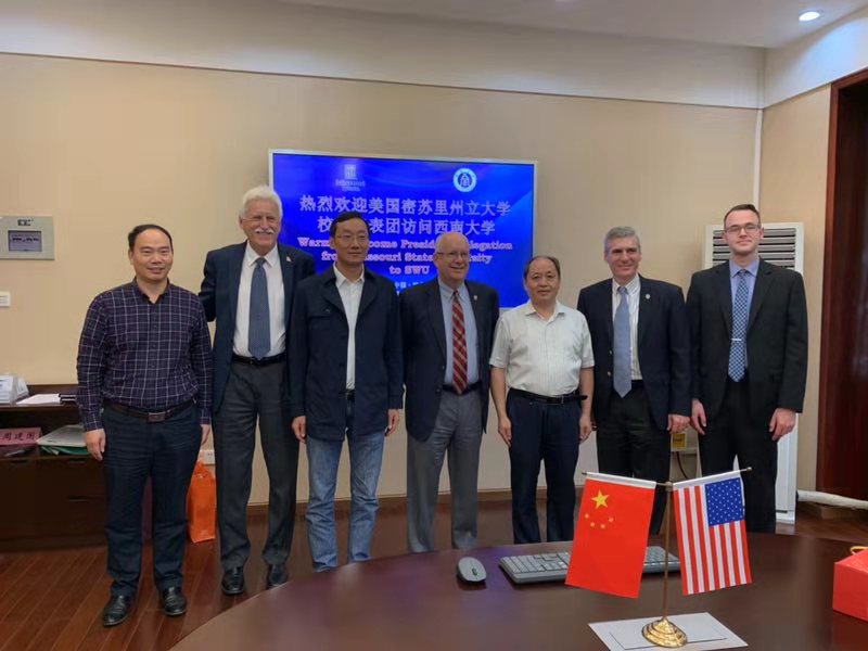 为践行高等教育“为党育人、为国育才”的初心和使命,创新yl6809永利集团人才培养模式,更新教育理念,加快人才培养国际化进程,培养具有国际视野的高素质人才,提高人才培养质量,实现人才培养面向世界的目标,9月25日下午,学院党委书记周国安、院长熊海灵、副院长胡继宽赴学校国际学院,与来校访问的美国密苏里州立大学校长Clifton M.Smart Ⅲ、副校长James Baker、副校长Brad Bodenhausen等协商国际合作办学事宜。