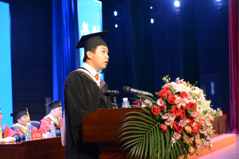 授位完成后,毕业生陈昊泽作为学生代表发言。他总结了四年的收获,深切表达了对学院领导、老师的感激、敬意和对同学、朋友的不舍之情,他表示今后将用实际行动回报父母,答谢老师,回馈社会。随后,汪维清副教授作为教师代表发言,希望同学们立鸿鹄志,做奋斗者,当实干家,勇做时代先锋,放飞青春梦想;希望大家面对机遇与挑战,要始终保持昂扬的斗志,旺盛的热情,不管风吹浪打,要具有胜似闲庭信步的心态。