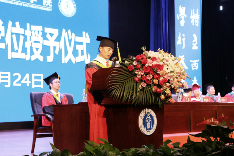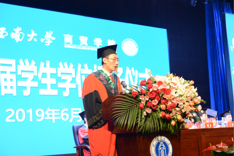学院院长熊海灵在典礼上寄语学生,对全体毕业生顺利完成学业、即将踏上崭新征途表示衷心的祝贺。他表示,四年时光里,同学们破茧成蝶、勤学善思,在菁菁校园写满奋斗的诗行。从今天起,大家将面临新的起点和希望,带着理想奔赴新的岗位,大学变成了母校,同窗变成了校友,归程变成了启航。如今,世界面临百年未有之大变局,国际形势波动幅度加大,“黑天鹅”满天飞,“灰犀牛”遍地跑。熊院长真切希望同学们面临国际乱象时不迷失方向,在遭遇问题时不心浮气躁,在担当作为中不瞻前顾后,在坚守初心中不忘家国情怀。他说,你们是母校的骄傲,母校永远是同学们的坚强后盾,会继续给予你们最大的帮助和支持。最后,他号召全院师生继续秉承“明德、崇智、博文、商道”之院训,坚持“教学立院、科研强院、服务兴院”的指导思想,砥砺前行,为社会培养更多的优秀人才,为早日实现民族复兴之中国梦做出应有的贡献!
