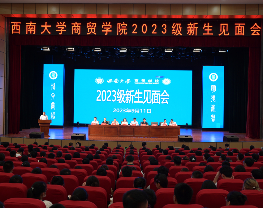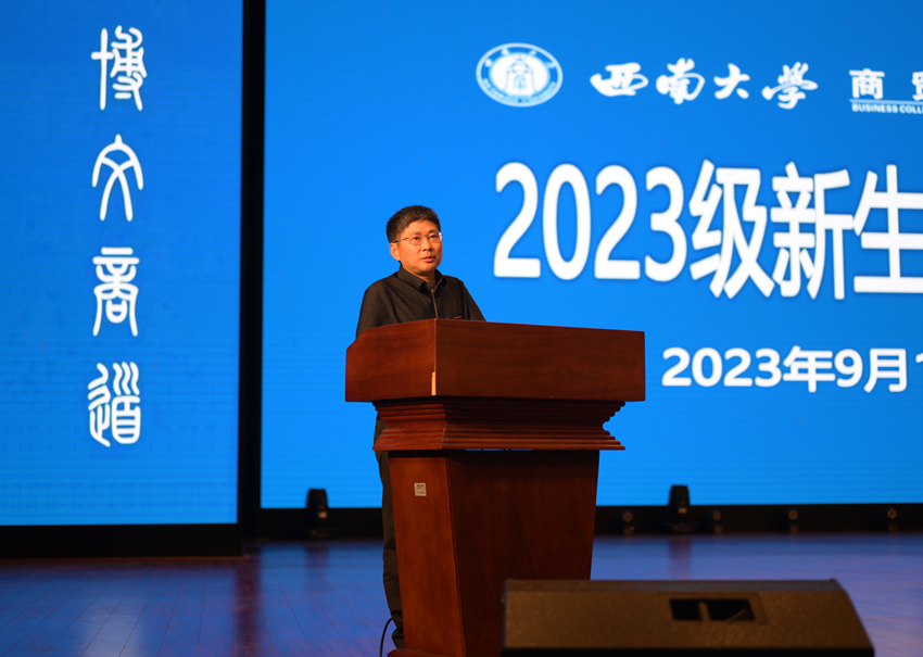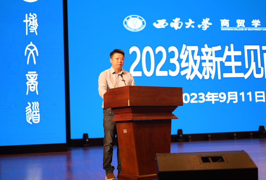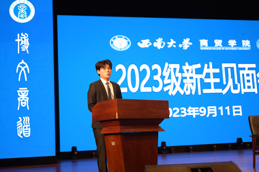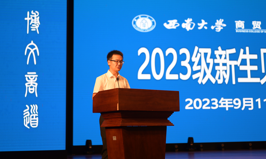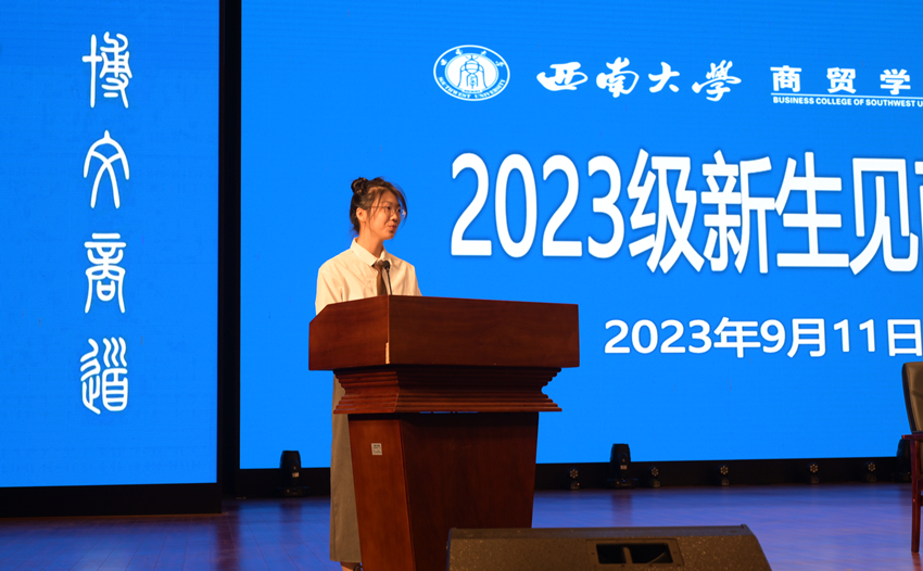 2023级信息管理与信息系统专业本科刘瑾作为新生代表发言。她在发言中分享了奋战高考的辛勤和圆梦西大的喜悦,号召全体新生深入践行“明德、崇智、博文、商道”的院训,意气风发地开始大学生活,创造属于自己的明媚未来。
