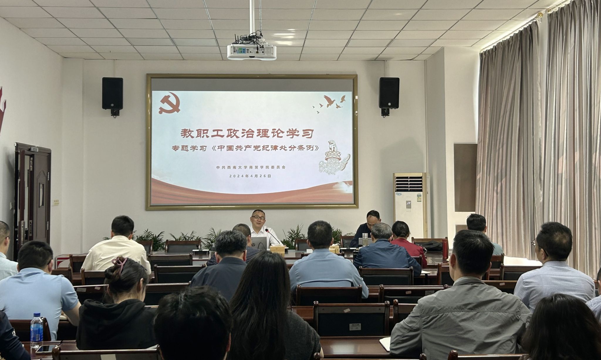 4月26日,yl6809永利集团开展教职工政治理论学习,学院副院长韩毅组织全院教职工逐章逐条学习《条例》的总则部分。通过本次专题学习,真正让学习党纪的过程成为增强纪律意识、提高党性修养的过程,推动《条例》入脑入心。