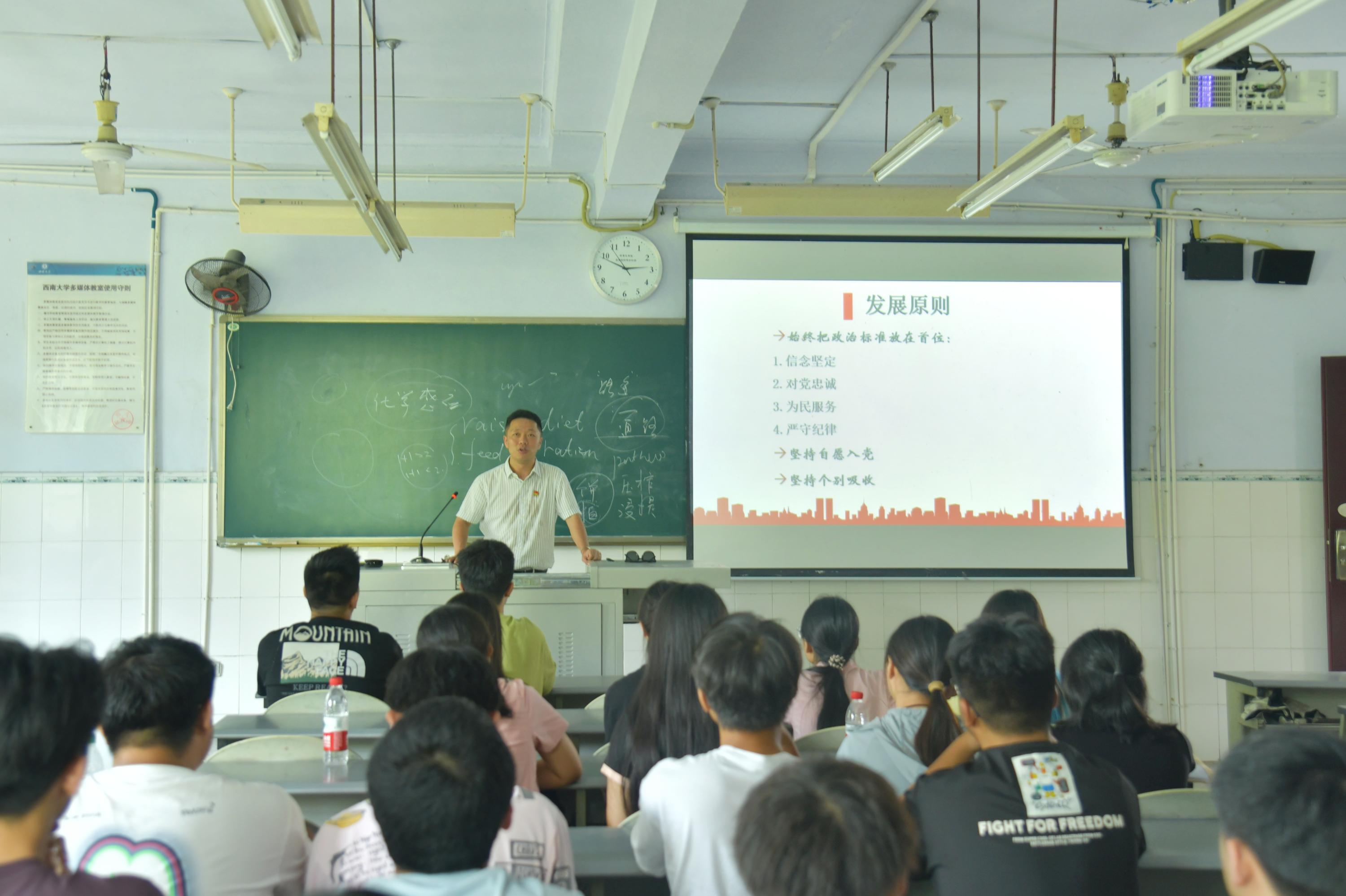 9月10日上午,学院在学生活动中心开展2024级新生入党启蒙教育。此次教育由学院党委书记王熹主讲,全体2024级新生参加。王熹书记以《学习贯彻习近平新时代中国特色社会主义思想 做有理想有本领有作为的新时代青年》为题,围绕习近平新时代中国特色社会主义思想;以中国式现代化全面推进中华民族伟大复兴,对新时代青年的要求;中国青年在时代中的担当;新时代中国青年应该怎么做等四个版块进行讲解和阐述,激励新同学们坚定理想信念,在新征程中努力担负起赓续红色血脉的责任和使命,为谱写新时代的绚丽篇章贡献青春力量。