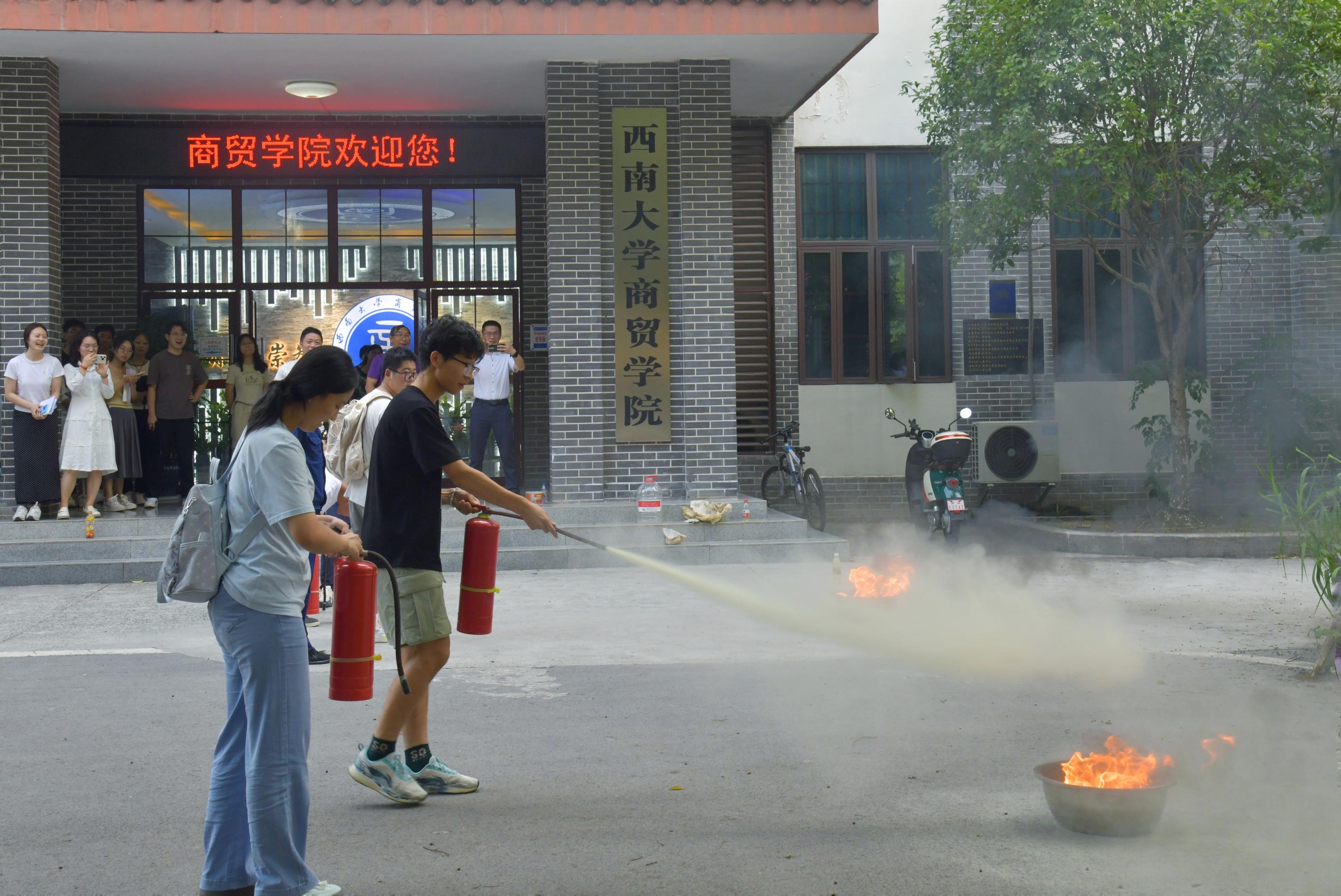 授课结束后,荣昌校区保卫工作办公室相关人员在八教门口指导开展消防应急演练,在场师生积极体会,尝试使用灭火器、了解如何打开消防应急设备,将讲座中的知识化作实操体验。
