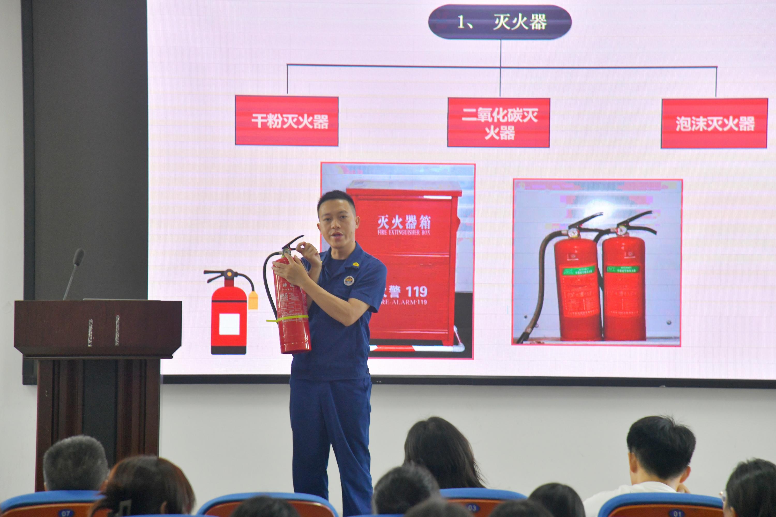 荣昌区消防救援支队吴俊从校园消防安全警示案例入手,重点介绍了学生宿舍、食堂、实验室、教室等火灾安全消防知识。同时现场展示了校园中常见的消防设施与消防器材的使用方式。吴俊强调,消防器材只能有限地抑制火灾蔓延,最重要的还是要避免违章用火、用电,将火灾发生的可能性降到最低。