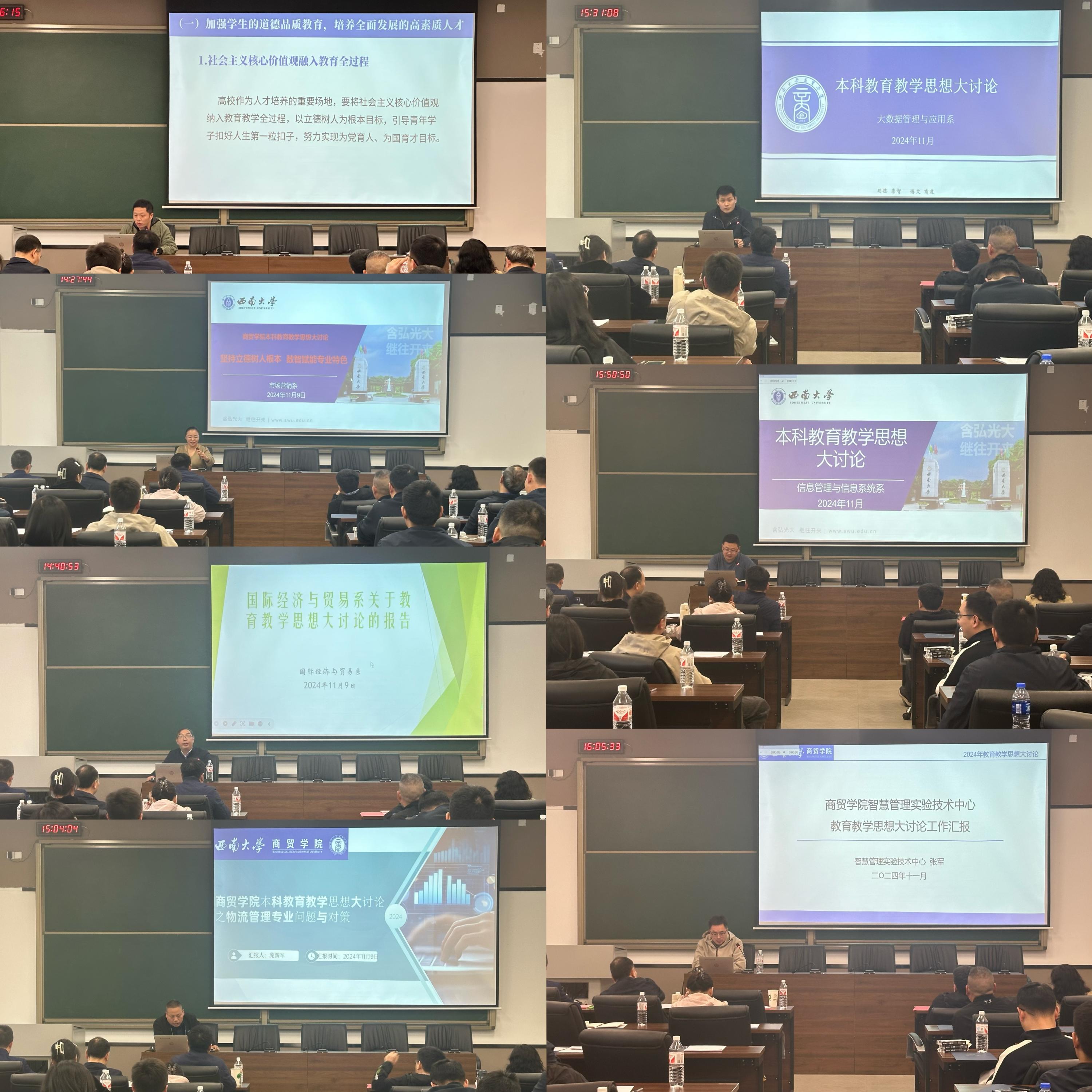为深入学习贯彻习近平新时代中国特色社会主义思想和党的二十届三中全会精神,深入学习全国教育大会精神,进一步明确学院“高级智慧商业管理人才”培养目标的实施路径,优化管理科学与工程学科点的建设方案,推动专业改造升级。根据学校“以本为本、以生为本,全面推进卓越人才培养”本科教育教学思想大讨论工作安排,11月9日下午,学院于yl6809永利检测中心宜宾研究院综合楼213举办本科教育教学思想大讨论。学院全体教职工参与。讨论会由学院副院长胡继宽主持。