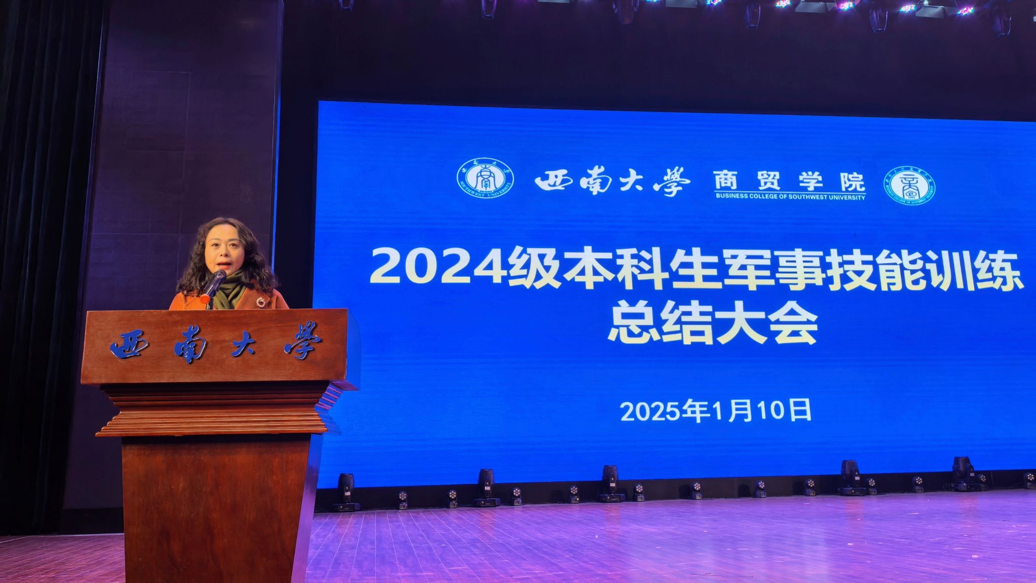 总结会上,兰书记对参训同学的顽强意志和坚定信念表示了肯定,并对全体学生提出了三点期望:一是希望同学们以此次军训为契机,深入剖析自我,全面提升综合素质,未来以更加饱满的精神状态和更加坚定的个人信念迎接成长与挑战;二是希望同学们始终保持克服困难的勇气和决心,把军训场上的优良品质带入日常学习生活中;三是希望同学们时刻铭记 “请党放心、强国有我” 的青春誓言,主动传承红色基因,坚定理想信念,立民族复兴大志,担奋斗强国重任。