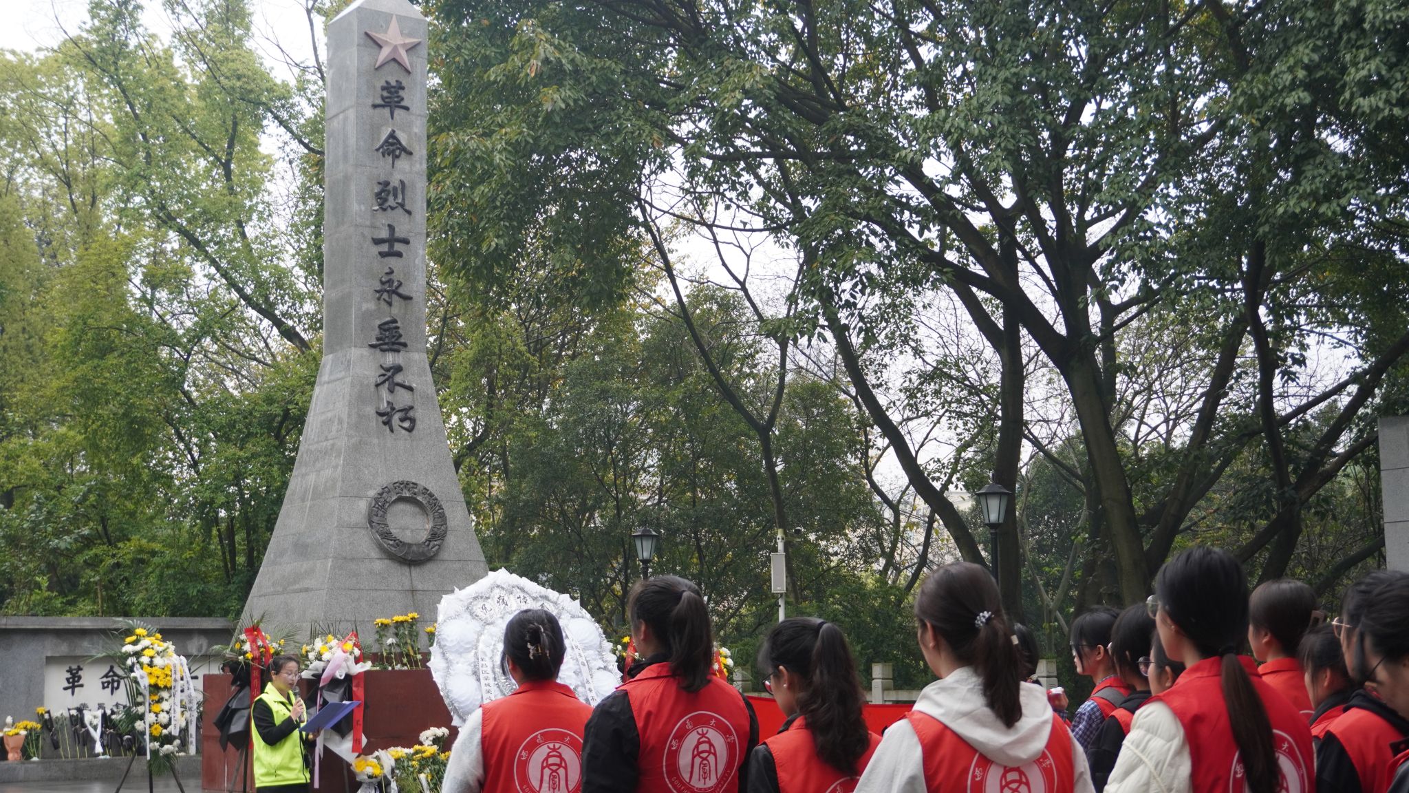 上午9时,支部党员与志愿者们整齐列队,肃立于烈士纪念碑前。陵园负责人深情讲述革命先烈的英勇事迹,将那段烽火岁月的壮烈史诗娓娓道来。全体成员垂首默哀,依次献上寄托哀思的鲜花,并以铿锵誓言许下“传承遗志、砥砺报国”的庄严承诺。简短而庄重的仪式让在场师生深刻感悟到信仰的伟力,更添使命担当。