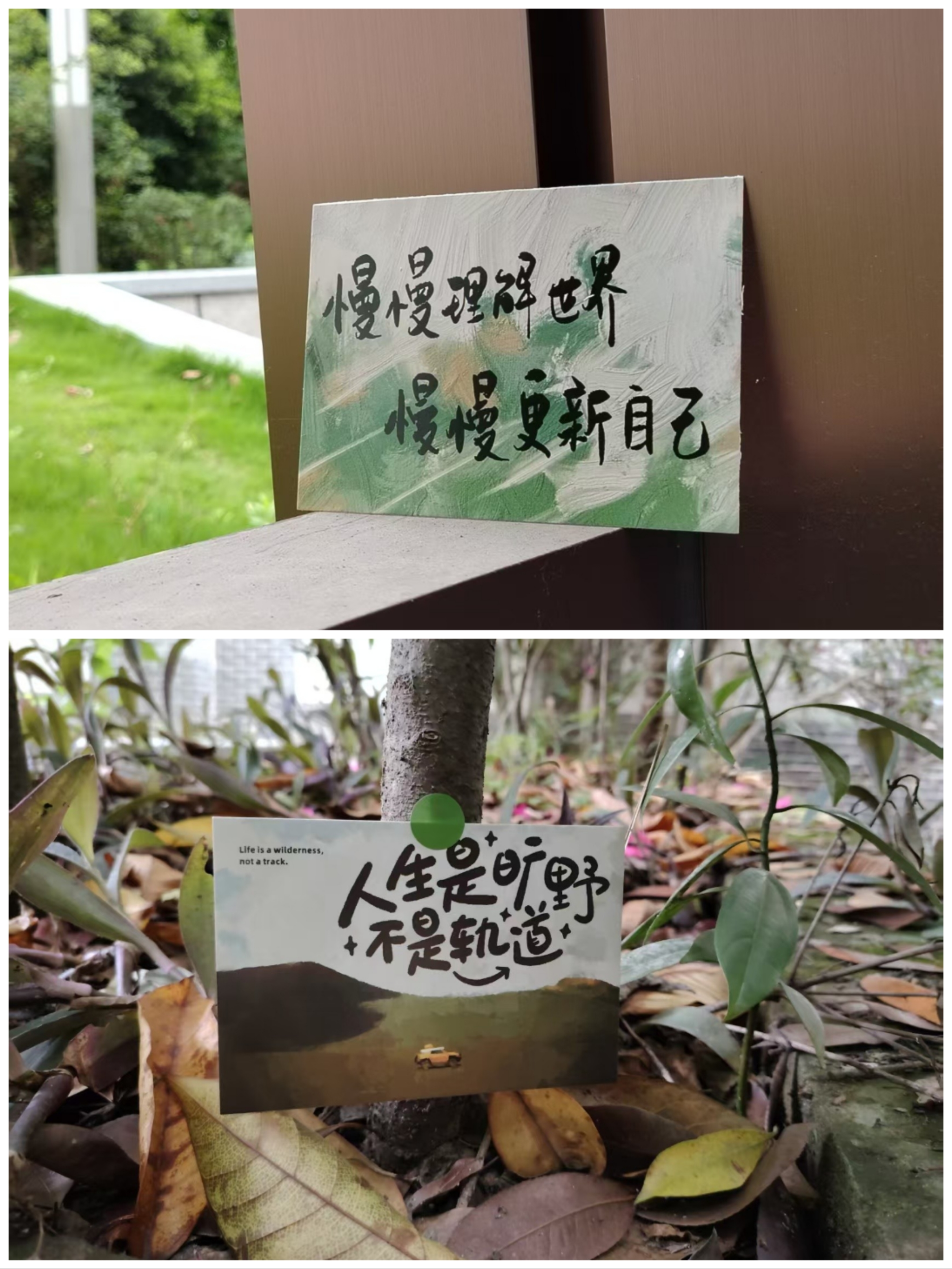 在“开启奇境之门:青芒逐宝”户外探索活动中,同学们手持寻宝图,化身勇敢的探索者,穿梭于校园的林荫小道与繁花绿地之间。他们在寻觅印有“心光伴旅·爱自己,温暖同行”主题暖心话语卡片的过程中,不仅与自然亲密接触,获得身心的深度放松,更在不经意间开启了一段充满惊喜与感动的自我发现之旅。当他们用寻得的卡片兑换到心仪的小礼物时,喜悦之情溢于言表。那些温暖的文字如同春日暖阳,轻柔地抚慰着每一颗年轻的心。