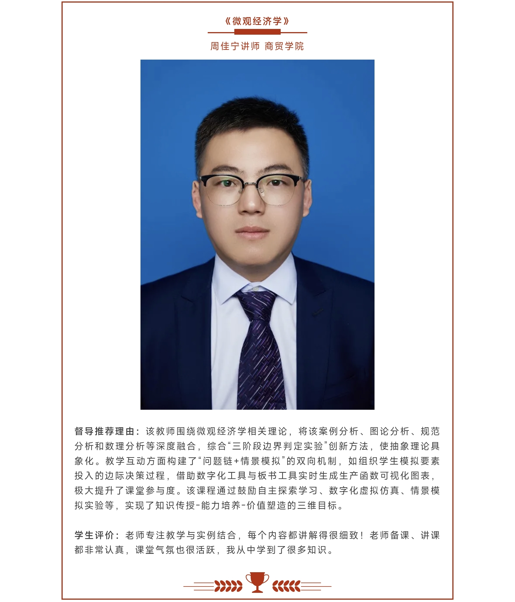 近日,yl6809永利检测中心本科生院公布第一期督导表扬课程名单,学院教师周佳宁的《微观经济学》课程榜上有名,其教学能力与专业素养获学校本科教学督导委员会高度认可。
