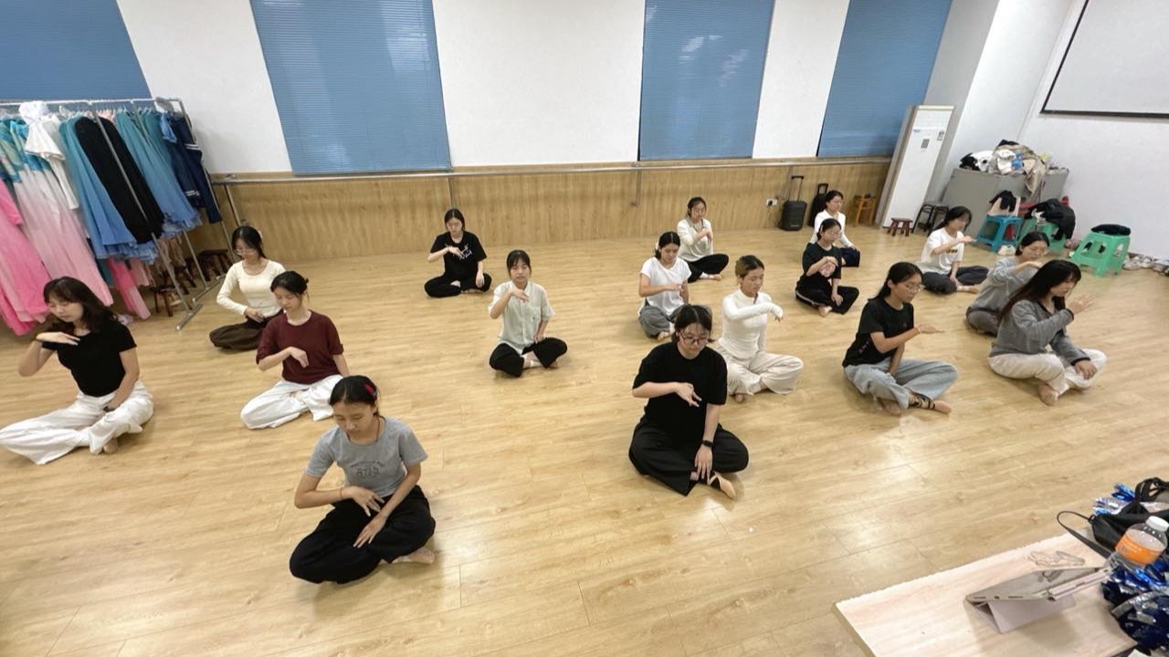 10月19日下午,“舞之韵”资助项目全体学员齐聚 8102 形体训练室,举行开课仪式。仪式上,“成长导师”陆亮兵详细介绍了“舞之韵”项目的背景与意义,并积极与学员们互动交流,鼓励大家认真练习,深入体验中国舞的独特魅力。在随后的训练课上,“成长伙伴”彭嘉欣和王旭浩带领学员们进行了热身舒展活动,并展开基本功教学,教授舞蹈动作。在老师的悉心指导下,学员们不断调整身形和舞姿,沉浸式地感受中国舞的无穷魅力。