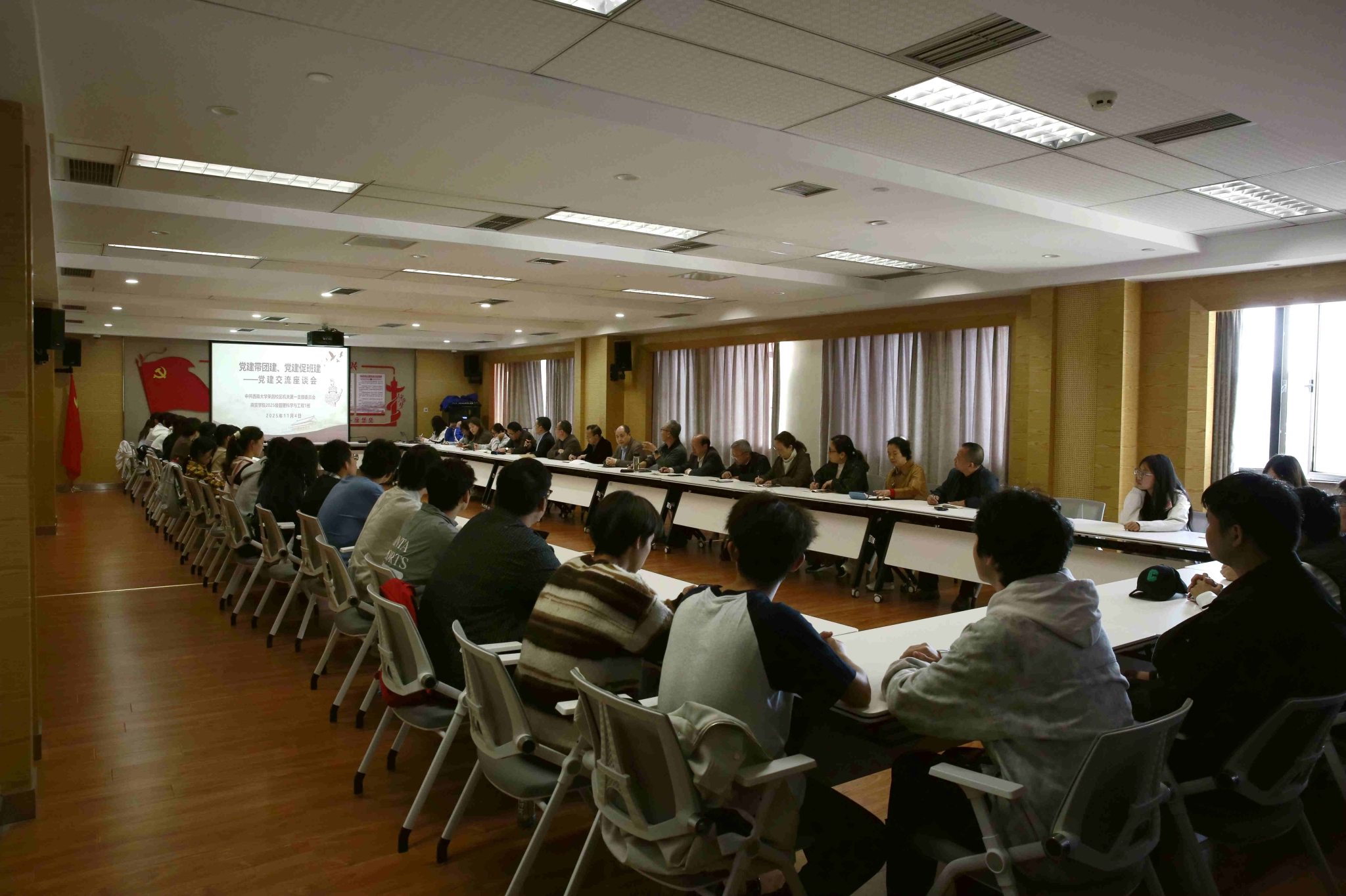 11月4日,荣昌校区机关第一党支部联系2025级管理科学与工程1班召开“党建带团建、党建促班建”交流座谈会,以党的建设带动基层班团建设。荣昌校区党工委书记、管委会主任周国安、副处级组织员包尔泉、机关党总支书记周克勇,学院党委副书记、纪委书记文武,荣昌校区管委会副主任兼 2025级管理科学与工程1班班主任曹烈斌,荣昌校区机关第一党支部全体党员、2025级管理科学与工程1班全体学生、2022级信管3班团支部书记与班长共同参会。座谈会由校区机关第一党支部书记蒋兴主持。