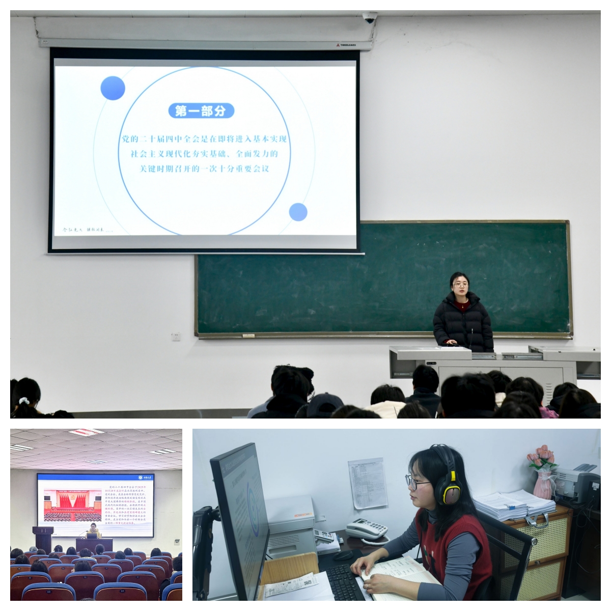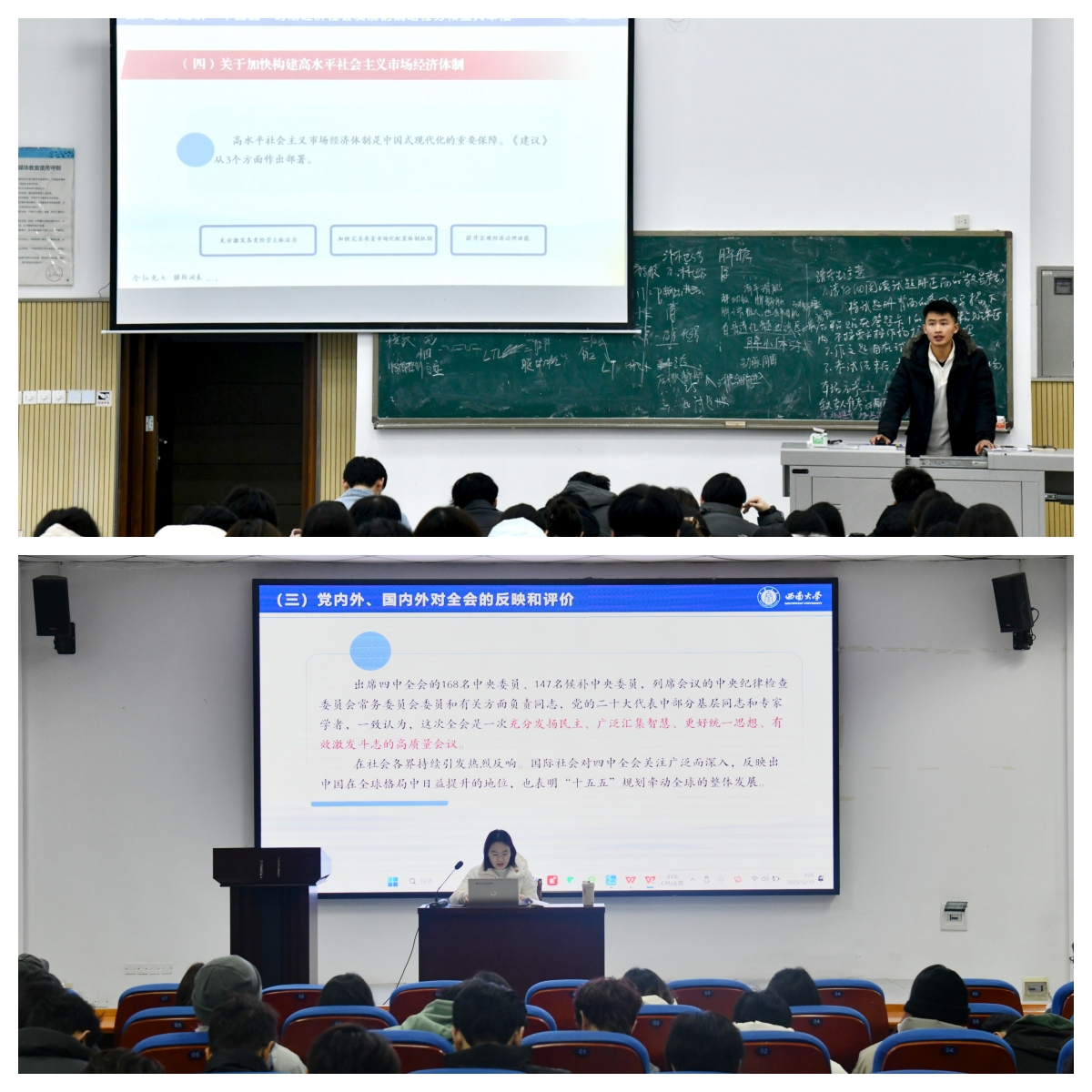 各宣讲人紧扣党的二十届四中全会精神的核心要义,从大会召开的时代背景和重大意义入手,结合详实的理论分析和生动的实践案例,对党的二十届四中全会精神进行全面系统、重点突出的解读。宣讲立足重庆市的战略定位和发展实际,将党的二十届四中全会精神的贯彻落实与地方经济社会发展规划有机结合,详细介绍重庆在推动高质量发展、深化改革开放、提升民生保障水平等方面的政策导向和具体实践,引导师生深刻认识个人发展与时代进程、国家命运的紧密联系。宣讲人还宣讲了学校贯彻落实全会精神的工作举措,全面呈现学校学习贯彻全会精神的创新实践和进展成效,营造良好的学习宣传贯彻全会精神的浓厚氛围。