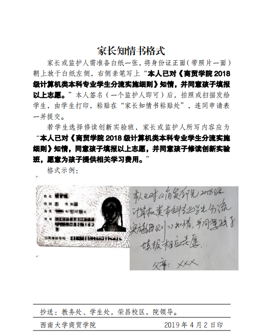 家长或监护人需准备白纸一张,将身份证正面(带照片一面)朝上放于白纸左侧,右侧亲笔写上“本人已对《yl6809永利集团2018级计算机类本科专业学生分流实施细则》知情,并同意孩子填报以上志愿。”本人签名(一个监护人即可)后,拍照或扫描发给学生,由学生打印,粘贴在“家长知情书粘贴处”,连同申请表一并提交。