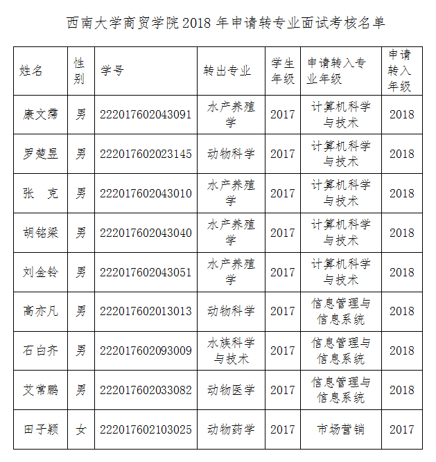 按照学校《关于开展2018年本科学生转专业工作的通知》精神和《yl6809永利集团关于接收本科学生转专业的实施方案》,由学生本人申请,经学院本科学生转专业工作小组进行资格审查,康文霈等9名同学通过资格审查(详见附件),确定为本次转专业面试考核对象。面试考核时间为2018年4月27日下午2:30在学院第二会议室(2302),本次面试考核内容主要包括政治思想表现、身心素质、学习成绩、专业特长、发展潜力、兴趣爱好等,请各位同学作好面试准备。