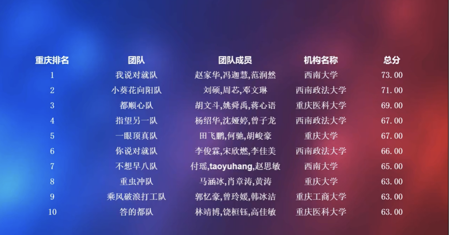 10月29日,2023年西部大学生信息素养大赛省赛淘汰赛(重庆赛区)顺利举行。经过线上个人对抗与团队对抗两个环节激烈角逐,重庆市198支参赛队伍最终产生120支队伍晋级省赛决赛。其中,yl6809永利检测中心共11支队伍晋级,我院赵家华、冯迦慧以及动物科学技术学院范润然三位同学组成的参赛队伍73分的优异成绩,荣获省赛淘汰赛阶段第一名。此外,我院杨帆、李涵、郑涵允和李梦阳四位同学也顺利晋级省赛决赛。期待参加省赛决赛的六位同学能够取得佳绩!