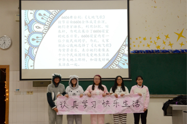 比赛开始后,参赛寝室陆续上台展示寝室设计和文化。其中,6615寝室以“超模休息室”为主题,结合她们有趣轻快的视频与讲解,展示了她们温馨的寝室氛围,充分体现了她们室友之间的友爱与互助;6219寝室以小猪佩奇为主题,展示了她们寝室的活泼可爱;6214寝室则以星空、心房为主题,让现场观众看到了一个梦幻的寝室。除了展示寝室设计,各参赛寝室还现场表演了动物情景剧、配乐诗朗诵、创意歌舞秀等形式多样的节目。